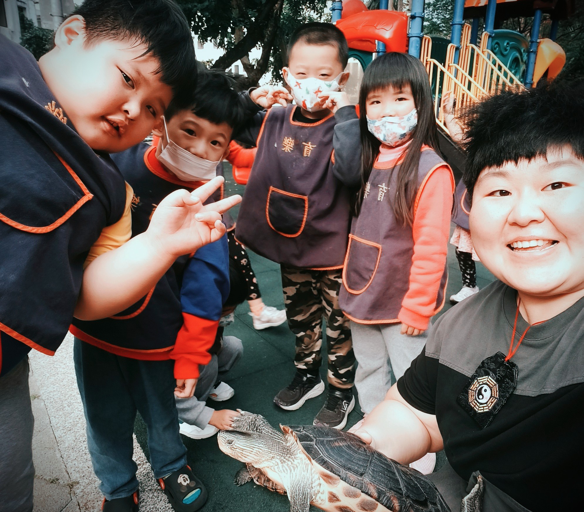 幼稚園小朋友 每當下班有空檔 遇到家裡附近的小朋友在公園 我就會回家抓烏龜 來給他們認識 有說有笑 小朋友的音量讓烏龜們 想要一直逃走的樣子 果然老師教得好 孩子態度真的有差 但孩子的問題真的讓我回答不完 幼教老師們,辛苦了 我能體會 但孩子的天真真的很可愛