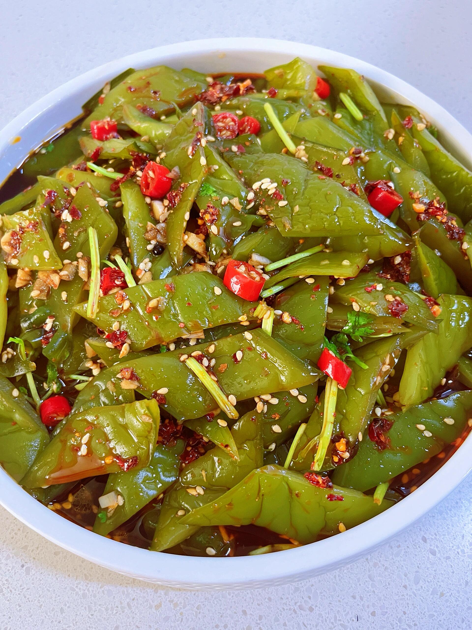 凉拌海白菜 食材 海白菜、小米辣、熟芝麻、蒜末、辣椒末、花椒、干辣椒、生抽、白糖、陈醋、香油、味精、香菜(可选)   步骤 1. 处理海白菜 海白菜放入清水中浸泡,泡去多余盐分,捞出后切成宽片。 ​ 2. 焯水去涩 锅中烧水,水开后放入海白菜片,焯水1分钟,捞出后充分沥干水分备用。 ​ 3. 准备配料 碗中放入小米辣、熟芝麻、蒜末、辣椒末,备用。 ​ 4. 制作热油 锅中倒油烧热,放入花椒和干辣椒炸香,炸出香味后捞出花椒和辣椒,将热油淋入装有配料的碗中。 ​ 5. 调制料汁 碗中调入2勺生抽、1勺白糖、2勺陈醋,再加少许香油和味精,搅拌均匀。 ​ 将调好的料汁倒入沥干水分的海白菜中,可加入香菜段,充分拌匀后即可食用。#海白菜# #凉拌菜#海白菜#天热吃什么#