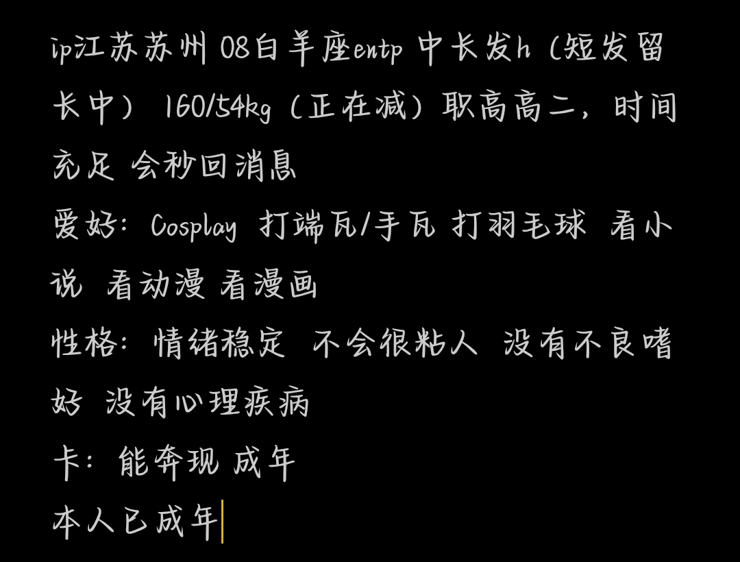 一起聊聊天吧,感兴趣的可以直接私聊。 我身上可能有的雷点:①我会看BL;②我不是纯血女同;③短发时会比较像男生;④不怎么吃别人的安利;⑤比较社恐;⑥性格有点优柔寡断;⑦不是特别主动的人,不喜欢单方面发很多消息(目前我能想到的就这些,其他没提及的欢迎补充)。 07年,偏泛性恋和无性恋,在长沙读大学,普本。普通人颜值,头发留长了又会剪短,身高155cm,体重48kg,穿衣打扮无固定风格。 性格慢热,情绪稳定,佛系随缘,说话比较坦诚直白,不骂脏话,不聊黄色(但会爆wc,md这种粗口),不抽烟喝酒。 边界感比较强,占有欲弱,安全感比较足。网上聊天不会爆金币,也不需要别人爆金币。 有一点点敏感的特质,说话比较谨慎,会照顾对方情绪,看到消息会及时回复,不会无故失联。不是特别会聊天,会主动分享自己的日常,也喜欢倾听。前期会比较主动,但希望有来有回,不要只有我主动开话题。 喜欢看小说,杂食党(主看BL),会看一点点漫画。 喜欢自然主题的纪录片(最爱蓝色星球2),对法医,人文相关题材的纪录片也有一定兴趣。 会看一些有趣的小科普,了解的东西比较杂。 自己也会写写画画(水平不怎么好😣)。 不玩游戏(但喜欢看恐怖游戏的实况),不怎么上网冲浪。 比较懒,唯一的运动就是散步。 欢迎你找我交朋友,但请不要无故失联、已读不回。 #自介#