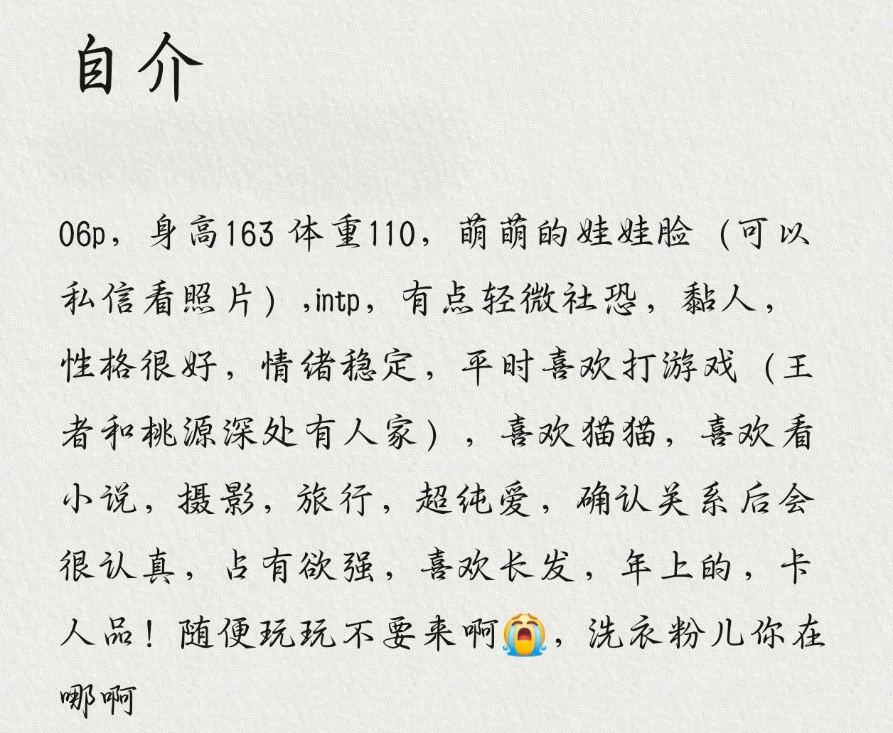 本人职业:二次元摄影 找个一起努力的对象 不卡颜 毕竟颜不可能吃一辈子