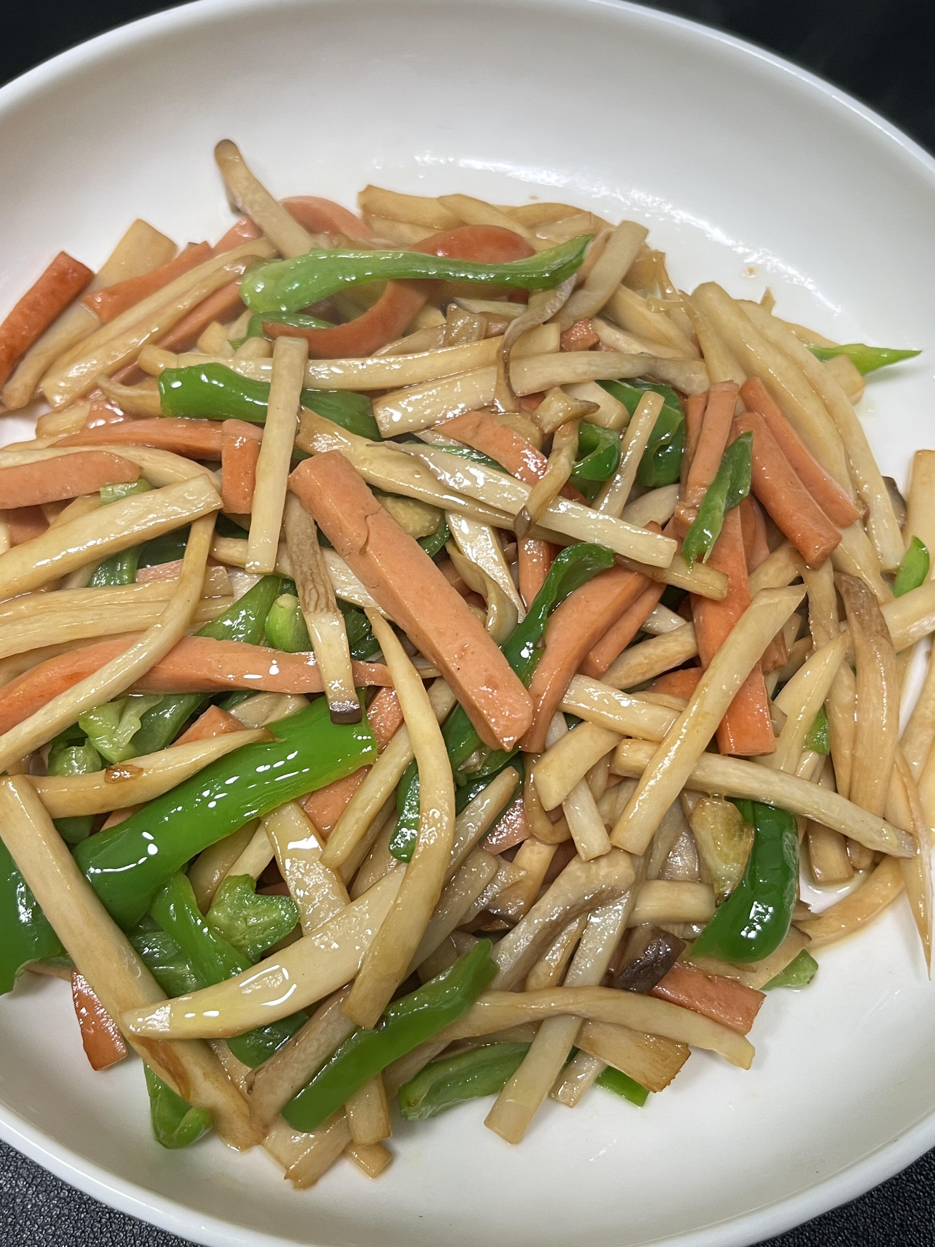 杏鲍菇炒火腿肠,太香了 杏鲍菇焯水后捞出挤干水份 热油炒香蒜末,放火腿肠煎熟 放入杏鲍菇翻炒均匀 加一勺生抽、一勺蚝油,适量盐、鸡精调味 放入青椒翻炒至断生即可 #超级下饭的家常菜#