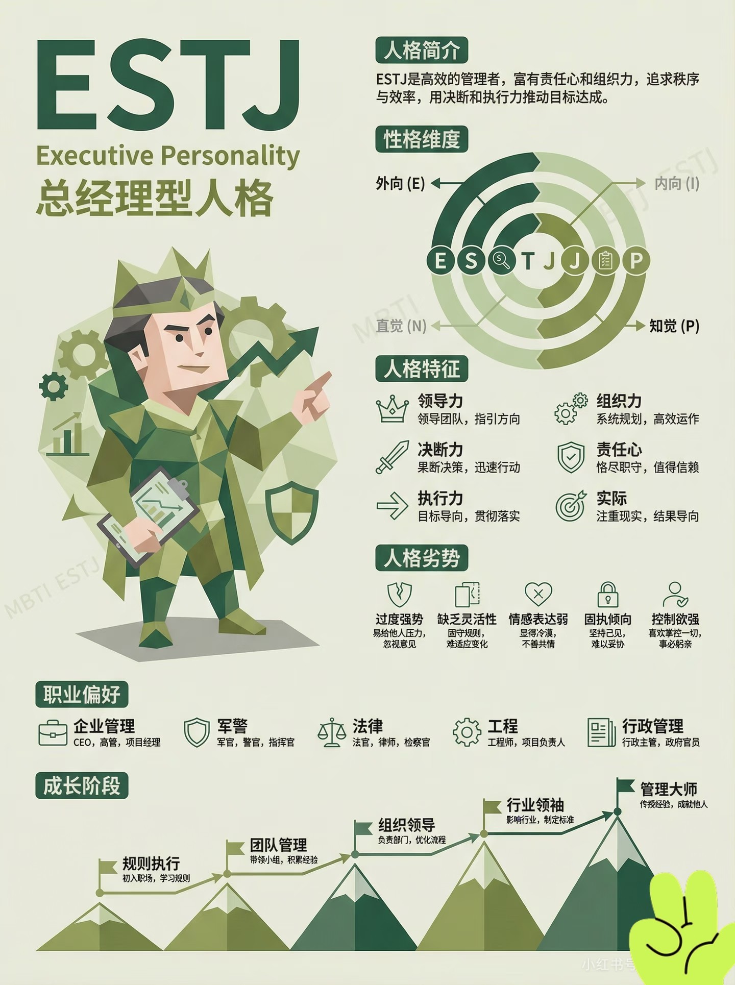 ESTJ,全称是“外向、实感、思考、判断”,在MBTI人格类型中被称为“执行者”或“监管者”。 他们就像生活和工作中的“总管”或“总经理”,把一切安排得井井有条。 核心性格特质 ​​务实高效​​:ESTJ是行动派,讨厌空谈,喜欢用事实和数据说话。他们擅长制定计划并高效执行,是团队里能让人放心托付任务的“定海神针”。 ​​逻辑主导​​:他们做决策时非常理性,依赖逻辑和因果关系,而不是直觉或情感。 这让他们在解决问题时非常精准,但也可能显得不够“人情味”。 ​​秩序控​​:他们极度讨厌混乱,喜欢一切按部就班。无论是工作流程还是家庭生活,他们都追求稳定和可预测性。 ​​责任感强​​:答应别人的事一定会做到,是朋友和同事眼中的“靠谱担当”。 ​​天生领导者​​:他们有很强的控制欲和组织能力,擅长在团队中担任领导或协调者的角色,确保每个人都各司其职。 优点与“槽点” ​​优点​​:超强的执行力、抗压能力MAX、社交直接坦率、细节控、责任感爆棚。 ​​“槽点”​​:控制欲强、固执己见、脾气来得快、情感表达生硬、讨厌突发变动。 职业与生活中的ESTJ ​​职场表现​​:ESTJ在需要执行力、规则和结构的环境中如鱼得水。他们非常适合财务、法律、行政管理、生产质量控制等岗位。 他们是天生的管理者,能把公司或家庭的大小事务安排得井井有条。 ​​感情中的ESTJ​​:在感情里,ESTJ追求稳定和实际的保障。他们不会盲目投入,但一旦认定,就会用实际行动证明诚意。 他们喜欢简单、真诚、可靠的人,这种纯粹的安全感能“吃定”他们。 ​​与ESTJ相处​​:和ESTJ相处,直接、坦率是关键。用事实和逻辑说服他们,比情绪化地讲道理更有效。 同时,也要包容他们偶尔的“脾气炸”和对规则的执着。 总的来说,ESTJ是那种能把生活过成“项目管理”的人,虽然有时显得强势甚至有点“脾气”,但他们的可靠和高效是无可替代的。 #MBTI 人格测验##MBTI 人格测验# #姬圈专属的MBTI性格测试#MBTI 人格测验#MBTI日常大公开#MBTI 人格测验#MBTI恋爱图鉴#