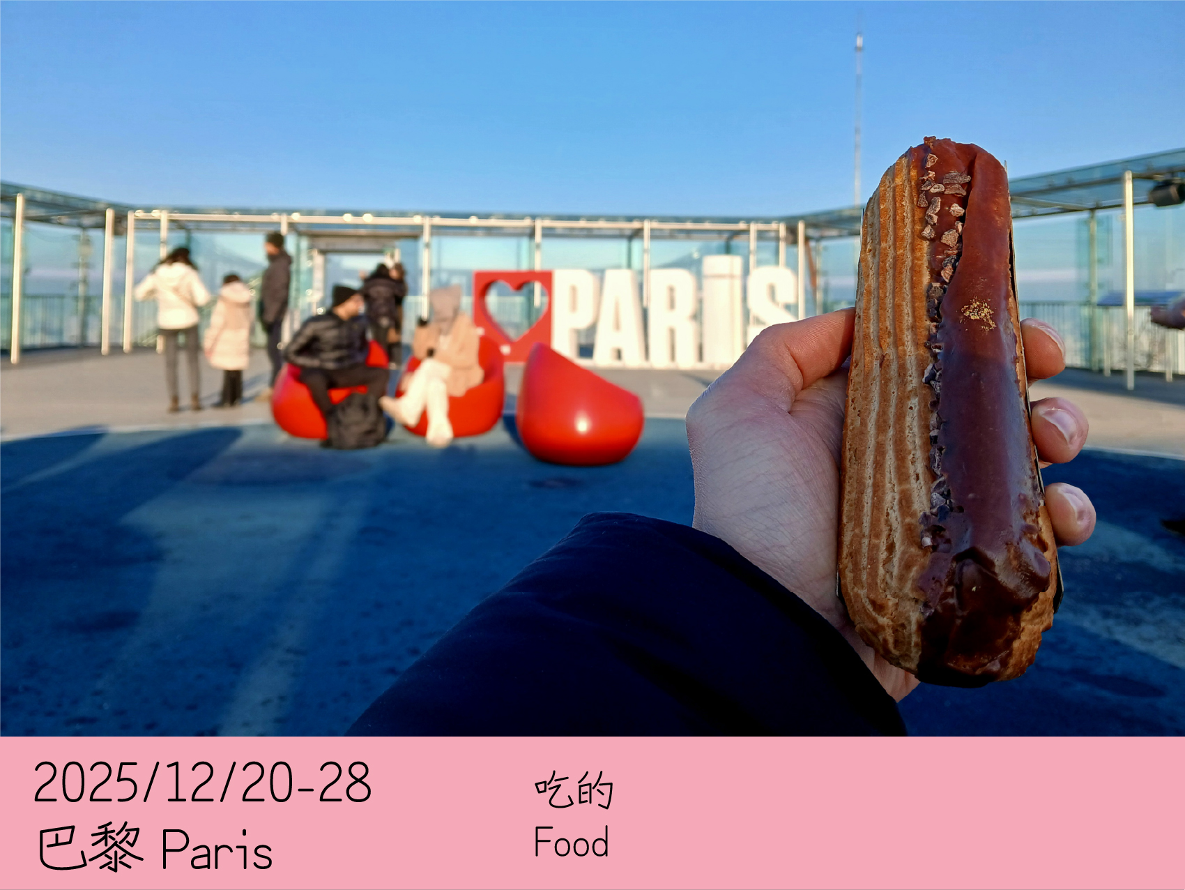 看到推荐说老佛爷百货Hausmann旗艦店(歌剧院对面)的屋顶拥有巴黎最棒的全景视野之一,而且免费开放。这里也是购物圣地,汇集众多高端奢侈品牌,我对此一窍不通,但既然就在附近还是决定去看看。但原来冬季期间需买16欧元的门票才能进入包溜冰场的屋顶,网站根本没说清楚到现场才发现🫠,从现场大量同样困惑的人群来看,显然不止我一人。最终只能在人潮拥挤的六楼通过窗户欣赏落日余晖🌤下的铁塔、歌剧院、蒙马特高地。又买了些巧克力当手信。百货店穹顶中央还矗立着巨型圣诞树🎄,不时上演灯光秀,也有个玻璃步道提供观景点(需提前预约,没去)。节日氛围延续至室外,圣诞灯饰、街头表演与熙攘的人群交织。Saw recommendations that the rooftop at Galeries Lafayette Hausmann (right opposite Palais Garnier) has one of the best panoramic views of Paris, and that it’s free. It’s also extremely popular for shopping with a huge range of fancy luxury brands, which I have no idea about, but decided to head there anyway since I was in the area. But apparently during the winter season, a €16 ticket is required to access the rooftop together with the ice rink, which again I only found out on the spot as the website is unclear about the need for a ticket, and judging from the huge crowds of similarly confused visitors I wasn’t the only one. So I ended up just admring the beautiful sunset over Eiffel tower, Palais Garnier, and Montmatre through the windows on the crowded 6th floor. Also bought more chocolates as gifts. A huge Christmas tree stood in the dome’s center with periodic light shows, while a glasswalk offers a vantage point (didn’t go, requires booking). The festive atmosphere continues outdoors, with Christmas lights, street performances, and bustling crowds.